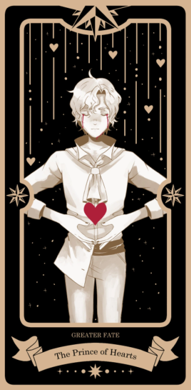 The Prince of Hearts' Deck of Destiny card depicts him as tragically handsome, with vivid blue eyes crying tears that match the blood staining the corner of his sulky mouth.